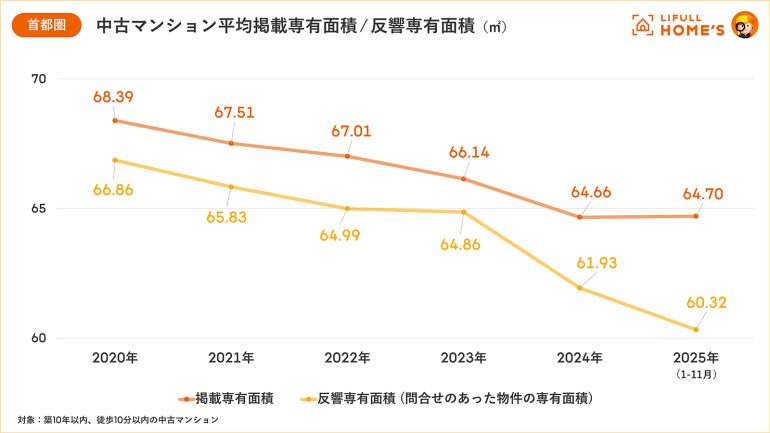 2020年から2025年(1月-11月)にかけては、掲載専有面積の縮小が3.69平方メートル(68.39平方メートル→64.70平方メートル)に対して、反響専有面積は6.54平方メートル(66.86メートル→60.32平方メートル)と2倍近く縮小していた。