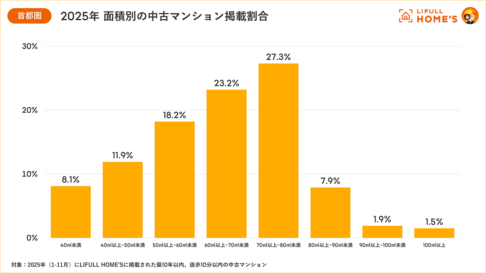 「首都圏」2025年 面積別の中古マンション掲載割合
