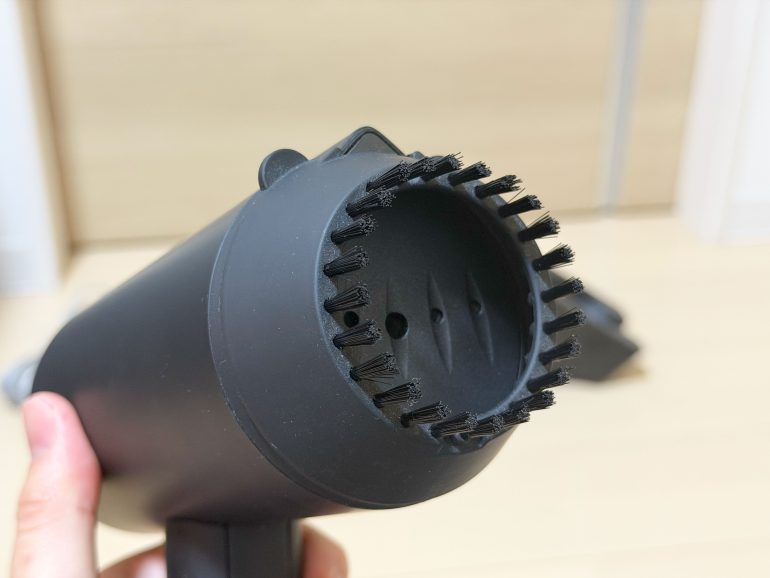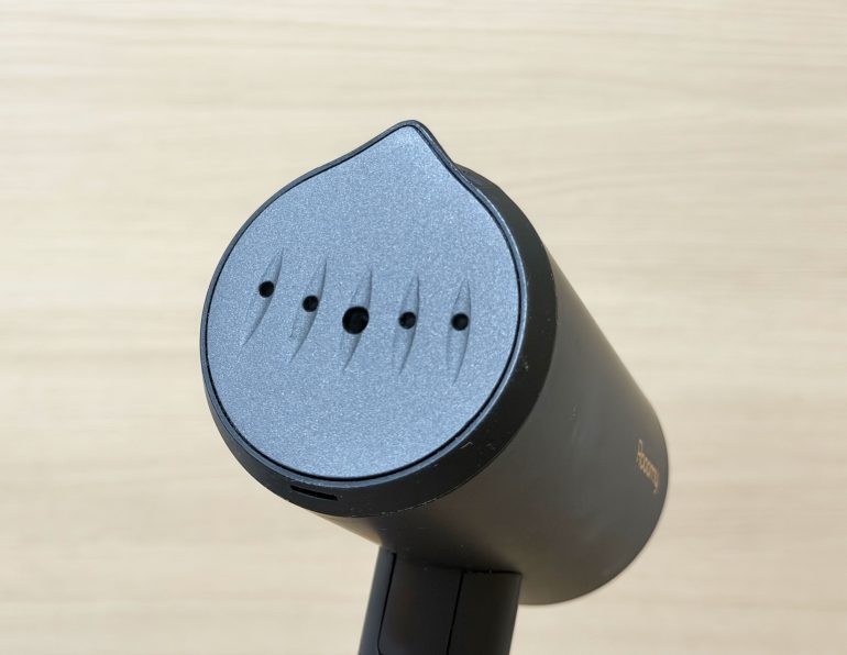 Rooomy Stylish Steamerは、一般的なドライヤーのような形状をしており、片手で自然に扱うことができる。重量にして60gほどNI-FS580より重いが、グリップの良さのせいかむしろ取り回しはいいように思う。スチーム噴射口はアイロンプレートにもなっており、NI-FS580などと同じく押し当ててアイロンのように使うことも可能だ。