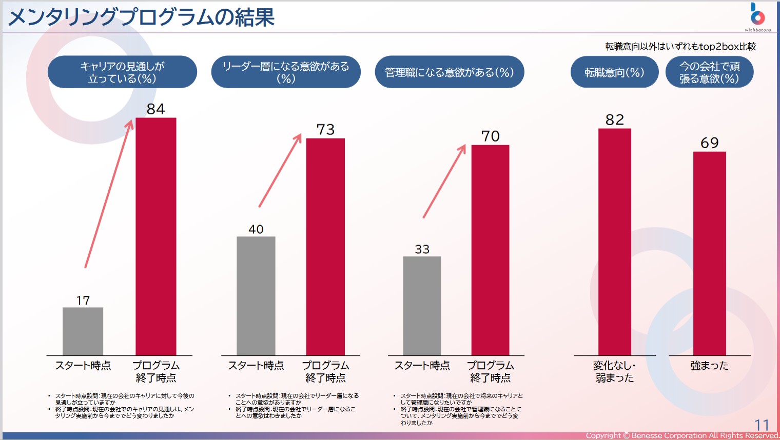 プログラム体験後、多くのメンティー(メンターから指導やサポートを受ける側の人)に変化が現れる。事前アンケートでは、キャリアの見通しが立っていると答えた人は17%だが、プログラム後には85%にまで跳ね上がった。「女性で7割が『管理職になりたい』と答えるアンケートは、ほかではあまりないと思います」と白井氏は、胸を張る。