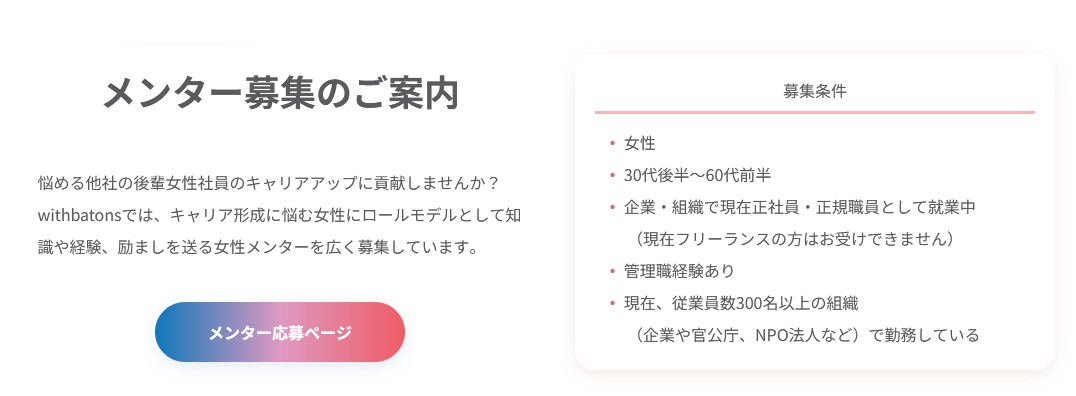 友人「メンターを始める前は『自分のキャリアももう終わりに近い』という閉塞感やあきらめを抱いていた。だが副業でメンターを始めたことがきっかけで、社会全体に目をむけるようになり、『自分にもまだまだ可能性はたくさんある』と感じられるようになった。その意味でウイズバトンはメンターとメンティー両方の自己効力感を向上させることができる、素晴らしい仕組みと感じていて、社内でのキャリアに行き詰まりを感じている若い女性管理職にもすすめたいと考えている」