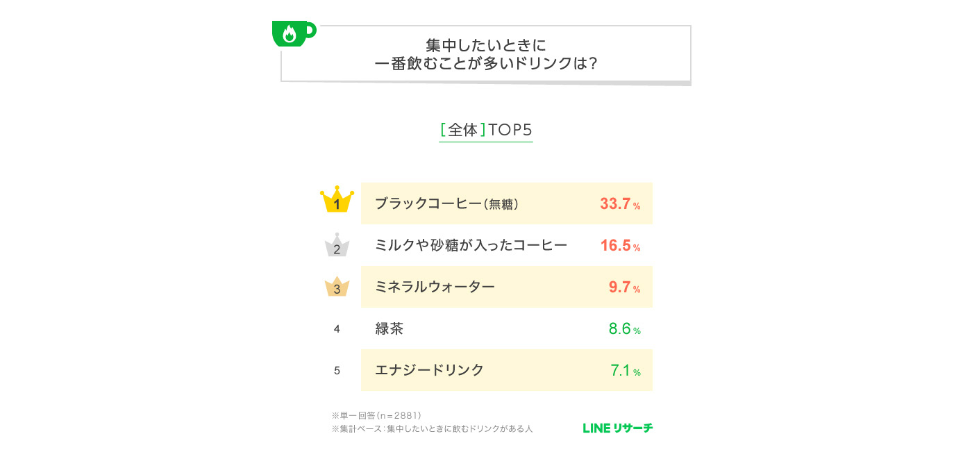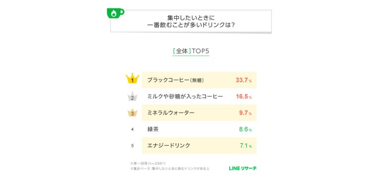 スマートフォン専用のリサーチプラットフォーム「LINEリサーチ」はこのほど、全国の15~69歳の男女3152名を対象に「集中したいときに一番飲むことが多いドリンクや、そのドリンクを飲む理由」に関する意識調査をし、その結果を発表した。