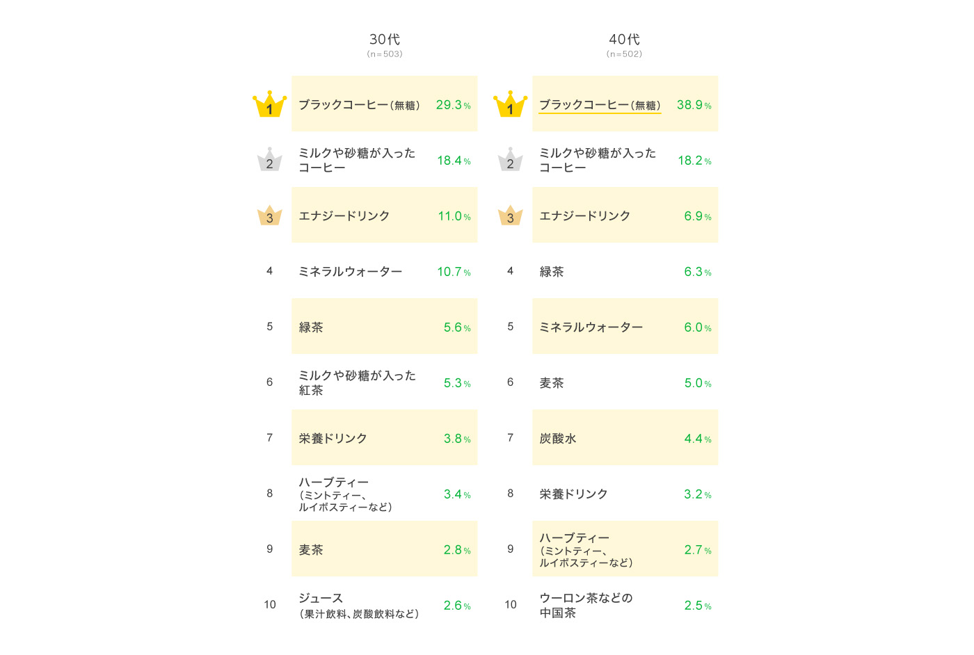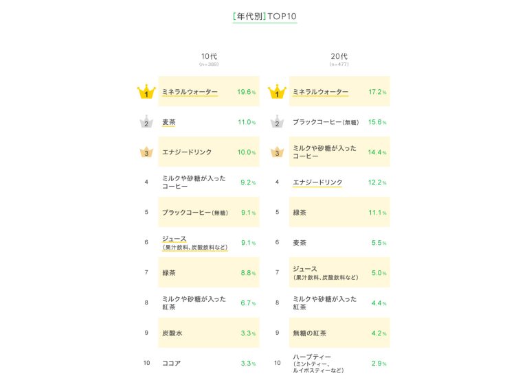 10代の2位以降は「麦茶」「エナジードリンク」がそれぞれ約1割で続いた。20代の2位以降には「ブラックコーヒー(無糖)」「ミルクや砂糖が入ったコーヒー」が並び、4位の「エナジードリンク」は、ほかの年代に比べて20代で最も高くなっていた。