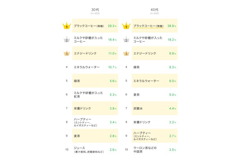 全体では、「ブラックコーヒー(無糖)」が最も高く3割強で1位に。2位は1割台半ばで「ミルクや砂糖が入ったコーヒー」がランクインし、コーヒーがTOP2を占めた。3位以降は「ミネラルウォーター」「緑茶」「エナジードリンク」が続いた。年代別にみると、10~20代では「ミネラルウォーター」が1位となった。