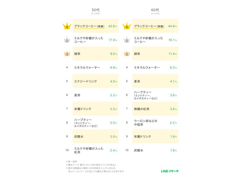 30代以降では、全体と同様に「ブラックコーヒー(無糖)」「ミルクや砂糖が入ったコーヒー」がTOP2となっている。グラフにはないが、男女別にみると「ブラックコーヒー(無糖)」「エナジードリンク」は女性よりも男性のほうが高い割合となった。特に「ブラックコーヒー(無糖)」は、40~60代男性で4割台半ば~4割台後半の高い割合となっていた。
