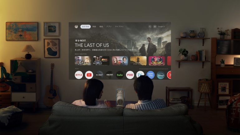 また、コンパクトサイズながら、38.48Whの大容量バッテリーを内蔵し、エコモードで最大1.2時間の映像再生または4時間の音楽再生が可能。さらに、GoogleTVを搭載し、NetflixやYouTubeなどの公式コンテンツにシームレスにアクセスできる。