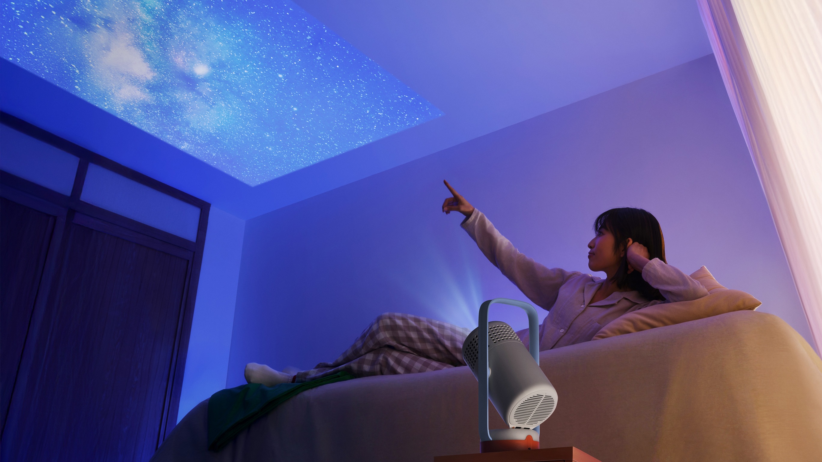 「Nova」は、大画面エンターテインメントとライフスタイルに寄り添う機能を融合させた、エントリーユーザー向けのポータブルプロジェクター。300度自由回転のジンバルを搭載しており、片手で軽く回すだけで投影方向を瞬時に切り替え、天井シアターを手軽に実現。ジンバルはそのまま持ち手としても使え、外出時の持ち運びも便利だ。