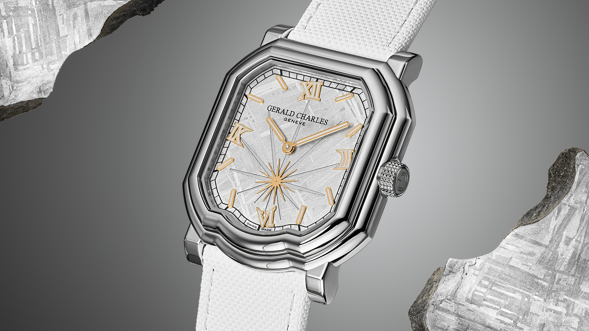 このサヴォアフェール ―マエストロ特有の複雑なケースジオメトリーに合わせてメテオライトを成形し、6時位置に爆発の光線を外科手術のような精度で彫り込む技は、ジェラルド・チャールズの時計製造の中でも、最も高度な表現のひとつを体現している。