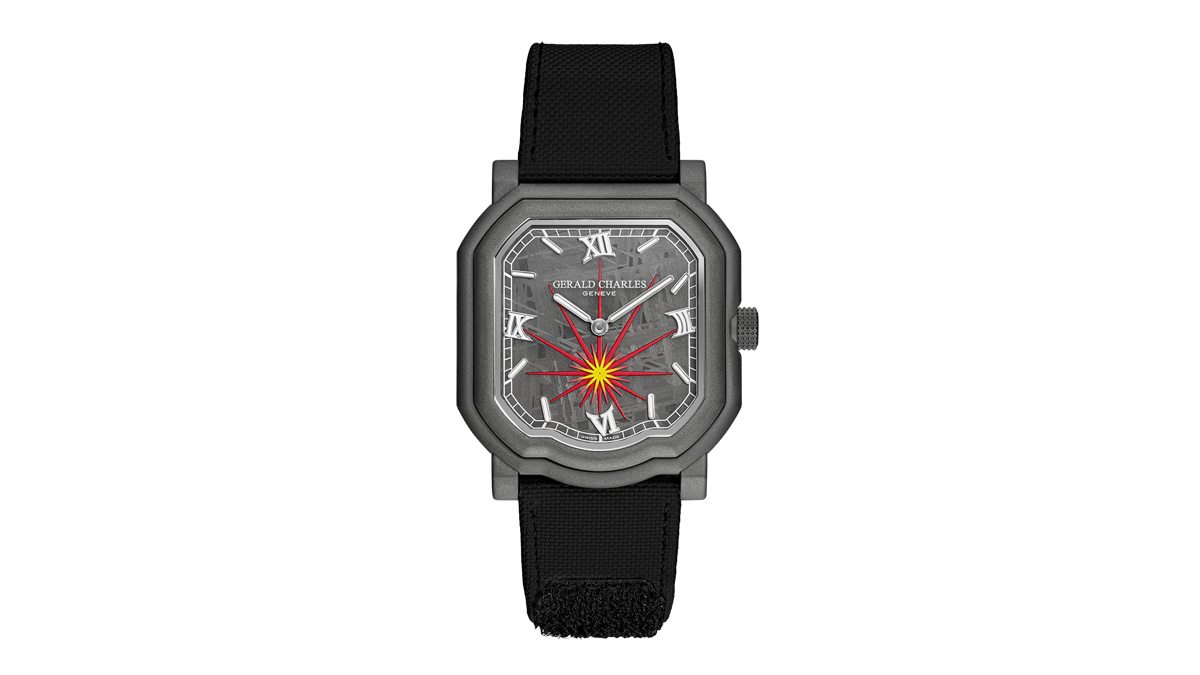 ジェラルド・チャールズのクリエイティブチームが考案したのは、印象的な二層構造。上層には薄くスライスしたメテオライト、その下にはアルミニウム製ベースプレートを配し、ダークブラストモデルには赤、シルバーモデルにはシルバーを採用している。