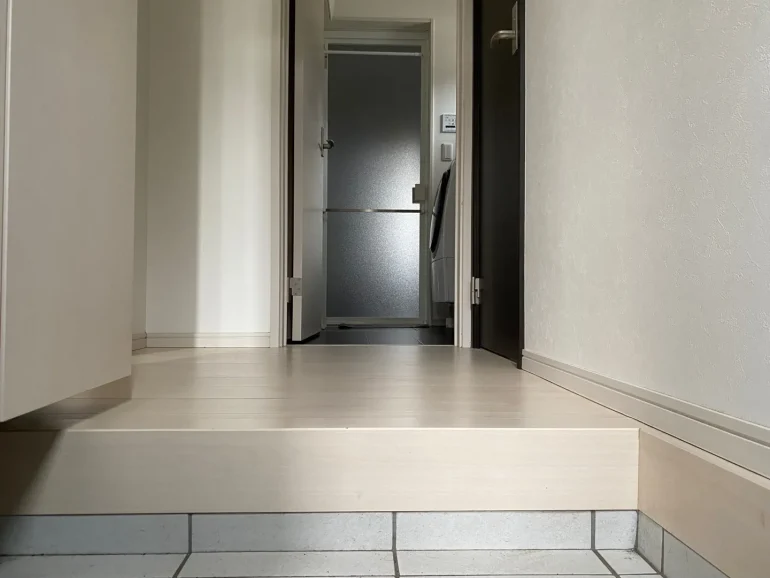 1軒目では居住空間確保のために玄関が狭く、靴を並べるスペースや玄関収納も最低限のサイズでした。