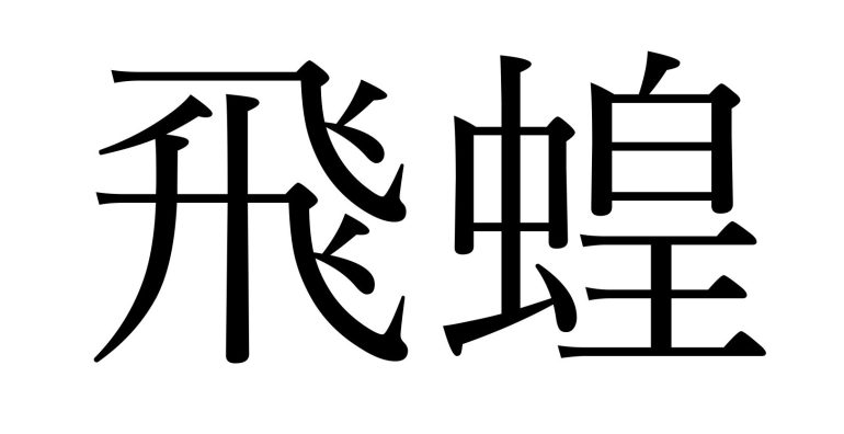 「飛蝗(ひこう)」はバッタと読みます。「飛」は、ピョン!と高くジャンプして飛び回る様子を表しており、「蝗」はバッタ類を表す字です。2つの字を合わせることで、空を飛び交うバッタの姿が連想されます。