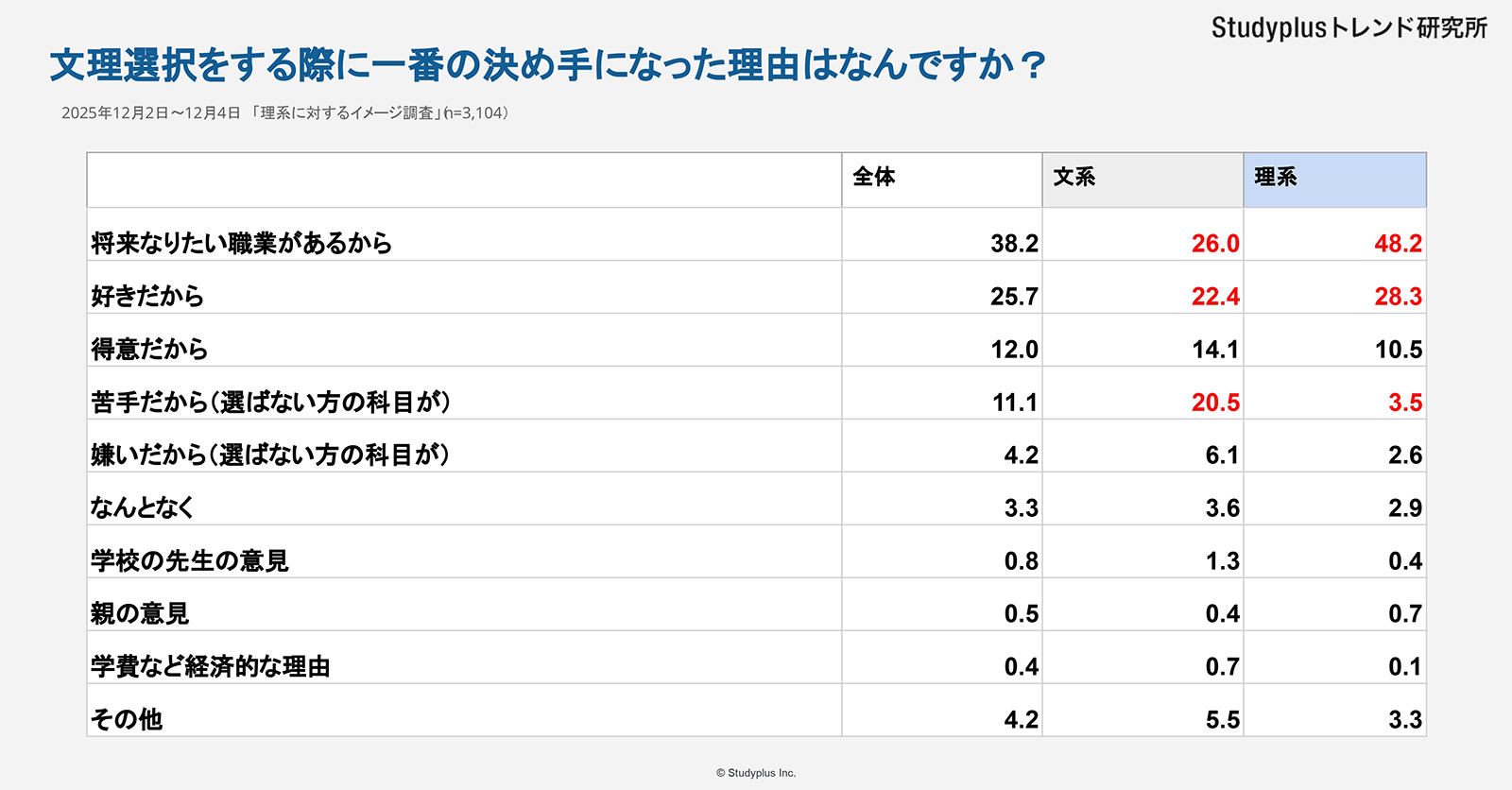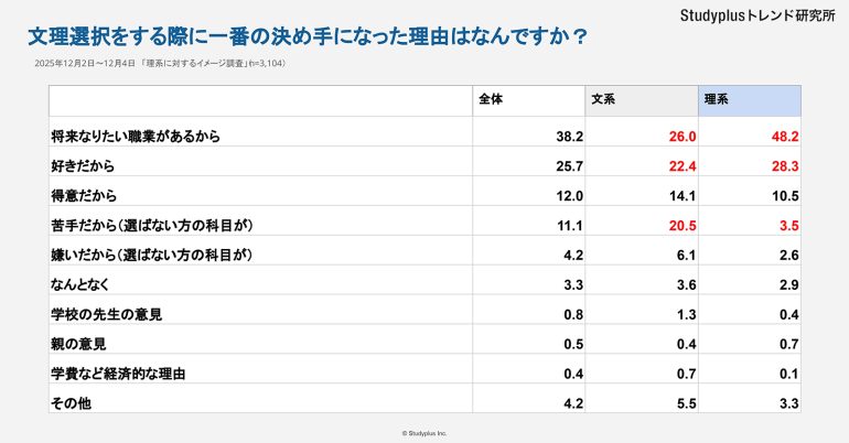 Studyplusトレンド研究所は、『理系に対するイメージ調査』として全国の高校1年生と高校2年生にアンケート調査を実施した。この調査は、高校生自身が周囲の環境や経済事情にとらわれずに「学びたいこと」を主体的に追求できる環境作りを目指して、文理選択の実態と課題を明らかにするために行われた。文理選択のポイントは、苦手意識よりも将来の職業を見据えていることだった。
