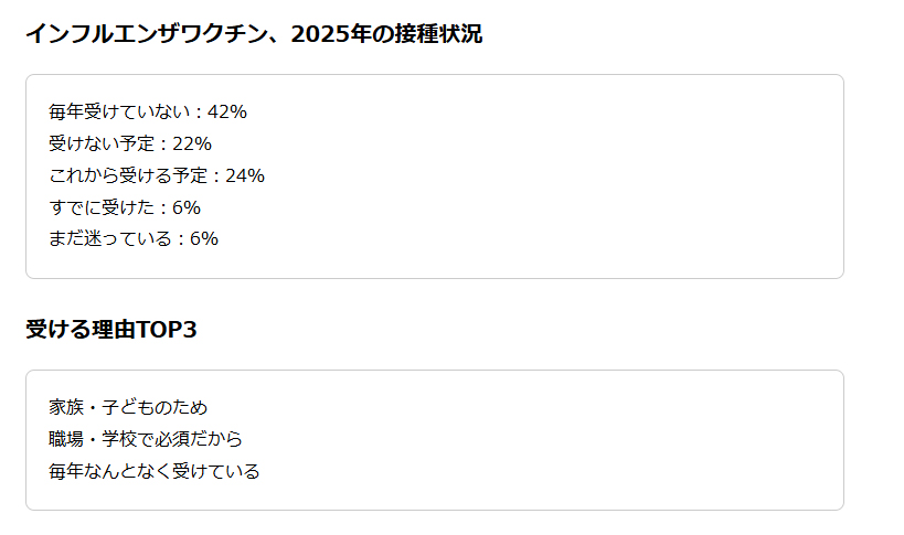 インフルエンザワクチンの2025年の接種状況では、「これから受ける予定」と「すでに受けた」を合わせても3割程度だった。30代から40代を中心に家族や子どもの健康を守る目的で接種を選ぶ傾向が見られて、職場や学校での規定による「制度的接種」も多かった。