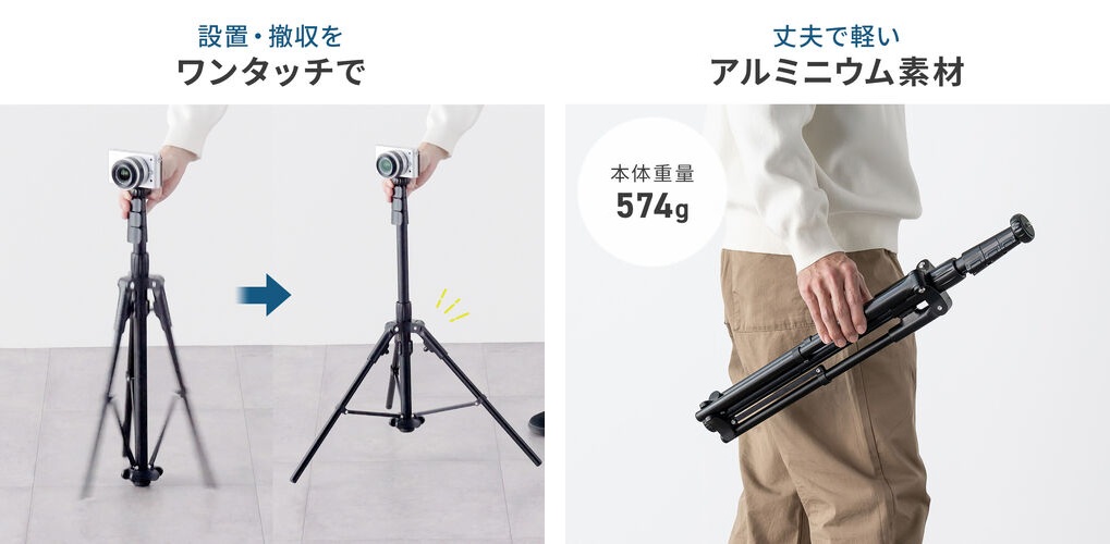 本製品最大の特徴は、中央の支柱を押し下げるだけで3本の脚が同時に展開する独自の自動開脚機構を採用しているところ。一般的な三脚のように脚を一本ずつ手で広げる手間が一切なく、ワンタッチに近い感覚で撮影体制を整えることが可能なので、シャッターチャンスを逃したくない屋外撮影はもちろん、急なWeb会議などでも活躍する。
