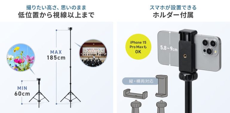 このほか、標準的な1/4インチネジに加え、幅58~95mmのスマートフォンに対応する専用ホルダーを付属しているのも嬉しいポイント。これにより、デジタルカメラやビデオカメラだけでなく、普段使っているiPhoneやスマートフォンをそのまま装着して安定した撮影が楽しめる。