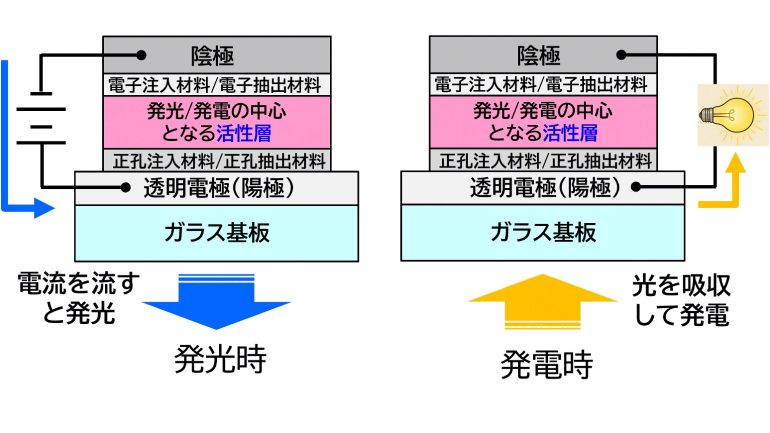 これまで、電気を与えて光を発する発光と、光を受けて電気を得る太陽光発電は逆過程のため、これら2つの機能を一つの素子で両立するのは困難だった。