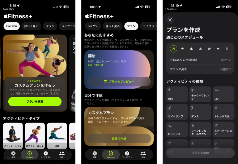 カスタムプランを使えば、選択したアクティビティと人気のアクティビティを反映したプランを作成してくれるため、気軽に運動を始められる。スケジュールも自動的に作成されるので、自分で目標を決め、コツコツと積み重ねていくのが苦手という人にもおすすめしたい。