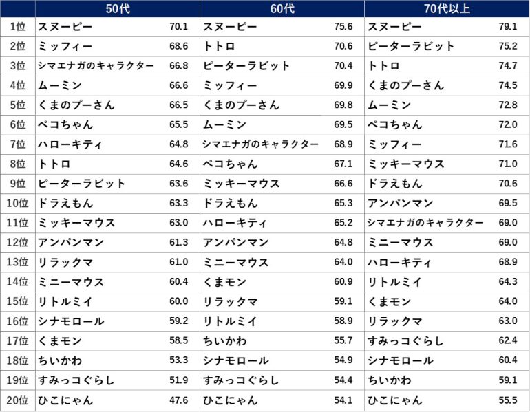 年代によって2位以下が大きく変動する「コーホート差」もポイントだ。同じうさぎキャラクターでも50代は『ミッフィー』で70代は『ピーターラビット』など、子ども時代に触れた体験が好みに現れている。世代ごとのランキングは、アニメの普及期やキャラクターグッズの登場期という「時代の空気」が反映されているのも特徴的だ。