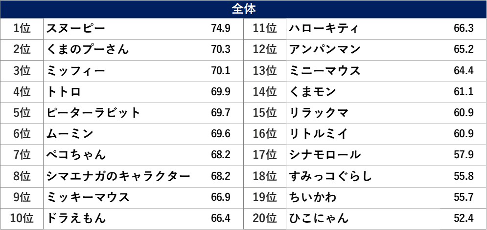 年代によって2位以下が大きく変動する「コーホート差」もポイントだ。同じうさぎキャラクターでも50代は『ミッフィー』で70代は『ピーターラビット』など、子ども時代に触れた体験が好みに現れている。世代ごとのランキングは、アニメの普及期やキャラクターグッズの登場期という「時代の空気」が反映されているのも特徴的だ。