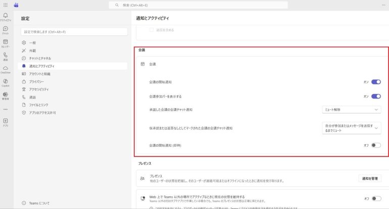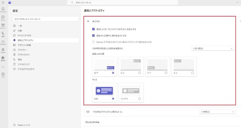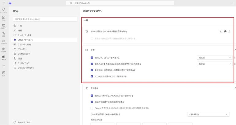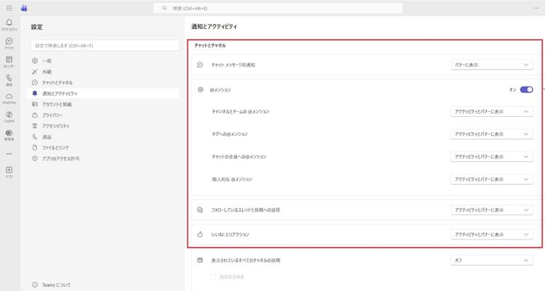 最初に確認すべきなのは、Teamsアプリ内の通知設定である。ここで設定が不完全だと、通知は引き続き表示される。