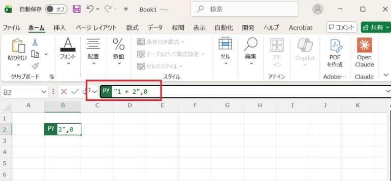 - Pythonコード=PY(“1 + 2”, 1)を入力する