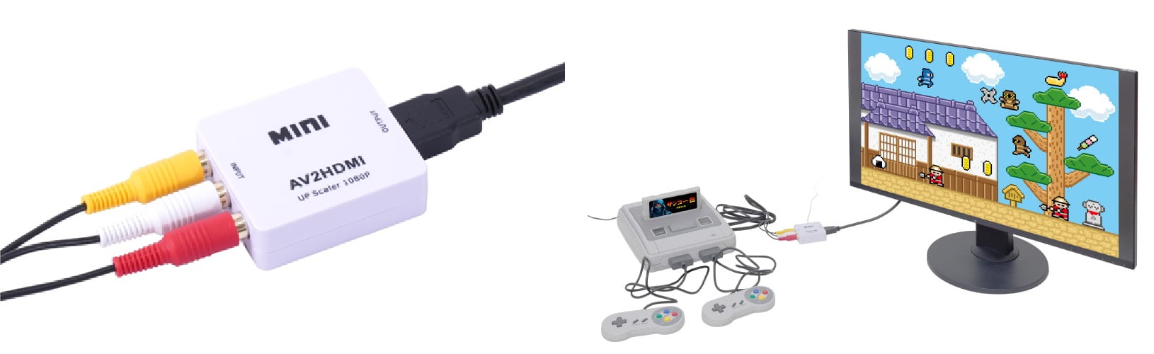 本製品は、レトロゲーム機やビデオデッキなどのコンポジット信号(赤・白・黄)を、HDMI信号に変換して出力できる映像変換アダプタ。近年増えているアナログ端子非搭載の最新テレビでも、本製品を接続するだけで懐かしの映像機器が使用可能になる。