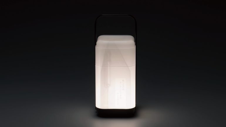 急な停電や避難生活の際には、ライトを点灯したスマホを入れて、外しておいた小物トレーを上からかぶせることで、やさしく光るランタンとして使用することができる。また、懐中電灯の使用も可能。小物トレーをセットしたまま、懐中電灯を上から差し込むことで、そのまま使用するよりも光が和らぎ、ランタン効果が生まれる。