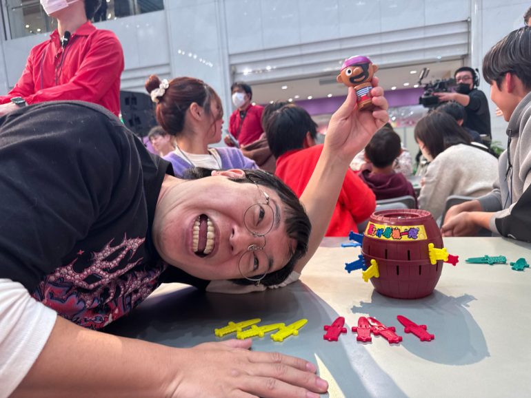 続いては、小さな男の子のいるご家族。まずは『ミスターダイヤモンド』、続いて『ウノ ハンパねぇ!』と、駆け引きがわかると有利に進められるゲームが続いたので、えげつない攻め方をして勝利をもぎ取って行くと、相手チームの男の子の顔がどんどん悲しい感じに。が、最後の運要素100%のゲーム『スーパーイタイワニー』でこちらが負けると、男の子は満面のドヤ顔をこちらに向けてきました。と同時に「そうそう、こういうトイゲームって子どもが大人たちにドヤ顔を見せつけてくるのが魅力の一つだったなぁ」なんてことを再確認しました。もちろん、そんな再確認より3戦全勝とならなかった悔しさの方が大きかったですが。