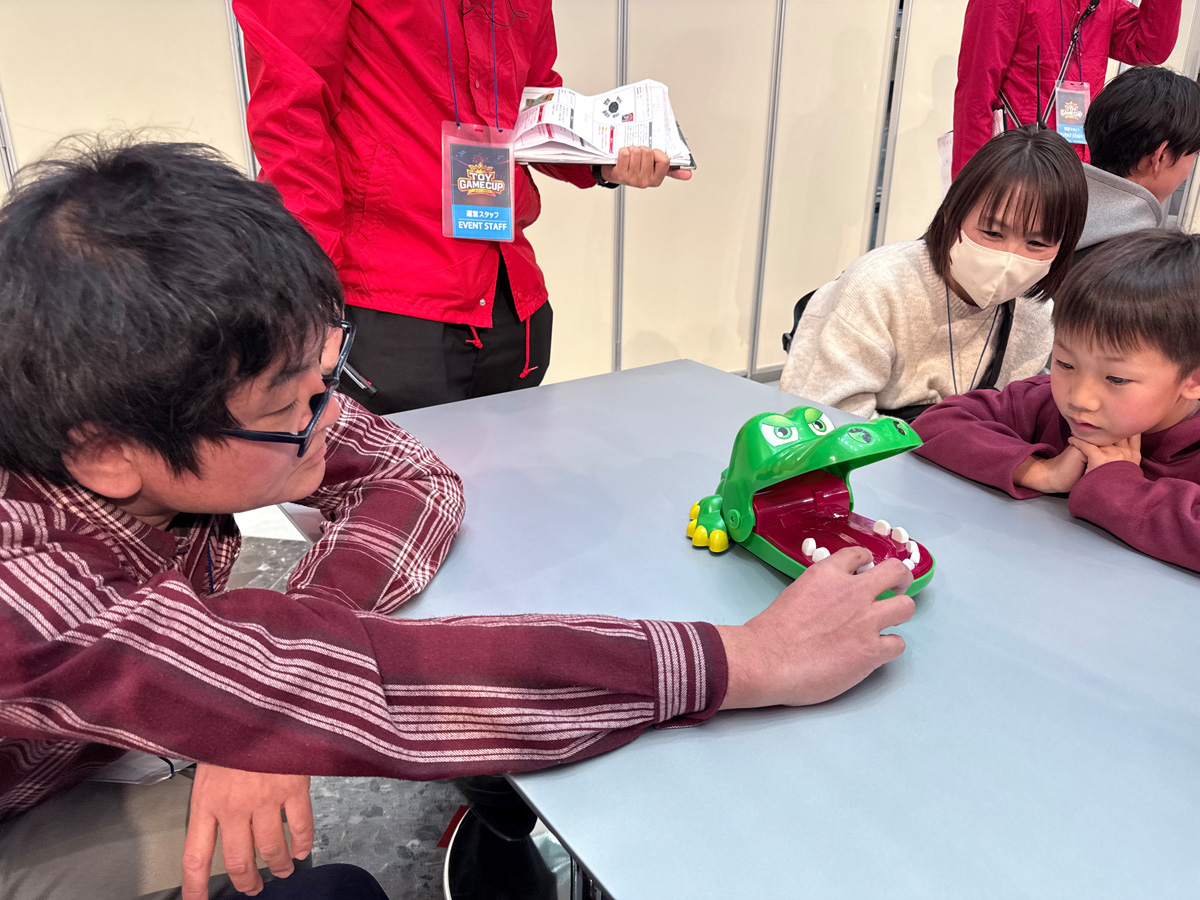 続いては、小さな男の子のいるご家族。まずは『ミスターダイヤモンド』、続いて『ウノ ハンパねぇ!』と、駆け引きがわかると有利に進められるゲームが続いたので、えげつない攻め方をして勝利をもぎ取って行くと、相手チームの男の子の顔がどんどん悲しい感じに。が、最後の運要素100%のゲーム『スーパーイタイワニー』でこちらが負けると、男の子は満面のドヤ顔をこちらに向けてきました。と同時に「そうそう、こういうトイゲームって子どもが大人たちにドヤ顔を見せつけてくるのが魅力の一つだったなぁ」なんてことを再確認しました。もちろん、そんな再確認より3戦全勝とならなかった悔しさの方が大きかったですが。