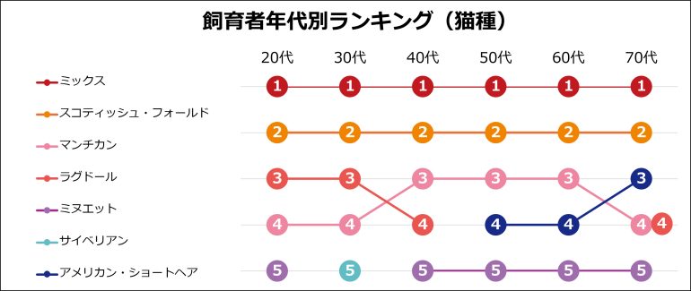 猫種では、トップ2は全年代同様で、3位以降は年代で動きのある結果となった。20~30代では「ラグドール」が3位だが、40~60代では「マンチカン」が3位、「マンチカン」から派生した「ミヌエット」も5位にランクインしている。