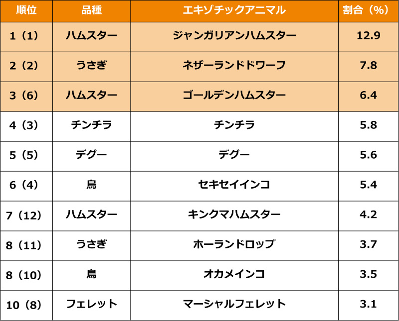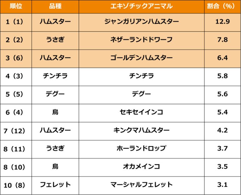 人気飼育小動物ランキングでは、昨年同様1位「ジャンガリアンハムスター」、2位「ネザーランドドワーフ」という結果になった。また、3位「ゴールデンハムスター」、7位「キンクマハムスター」と、ハムスターが3種ランクインしている。ハムスター、うさぎ、チンチラやデグー、インコ、フェレットなど多様なエキゾチックアニマルがランクインした。