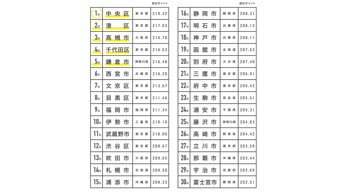 2021年にトップだった中央区が、初の全国調査でNo.1に返り咲いた。