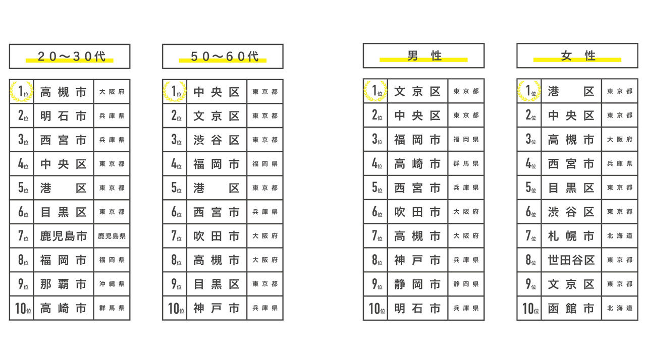 20代・30代TOP3は、1位高槻市、2位明石市、3位西宮市と関西圏の都市が占めた。逆に50代以上の場合、1位中央区、2位文京区、3位渋谷区と東京都心で占められ、年代によって対照的な結果となった。