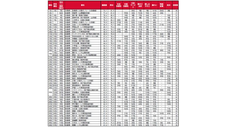1位~6位の駅は偏差値70台の高い評価、また7位~50位の駅も偏差値60台で相対的に子育て世帯にとって住みここちが良いという評価になっていた。