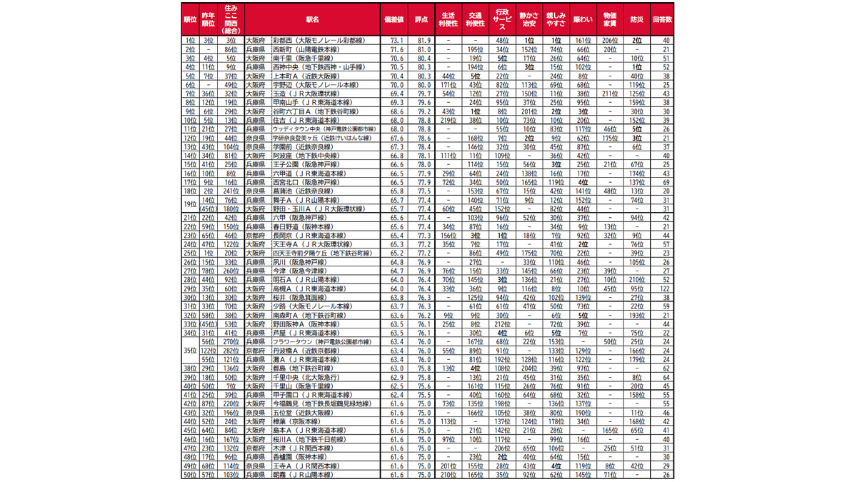 1位は、大阪府茨木市に位置する彩都西で、「住みここち<関西版>」では3位となっている駅だ。2位は初登場の、兵庫県明石市に位置する西新町で、昨年は累計回答者数が20名未満でランキングの集計対象外であった。
