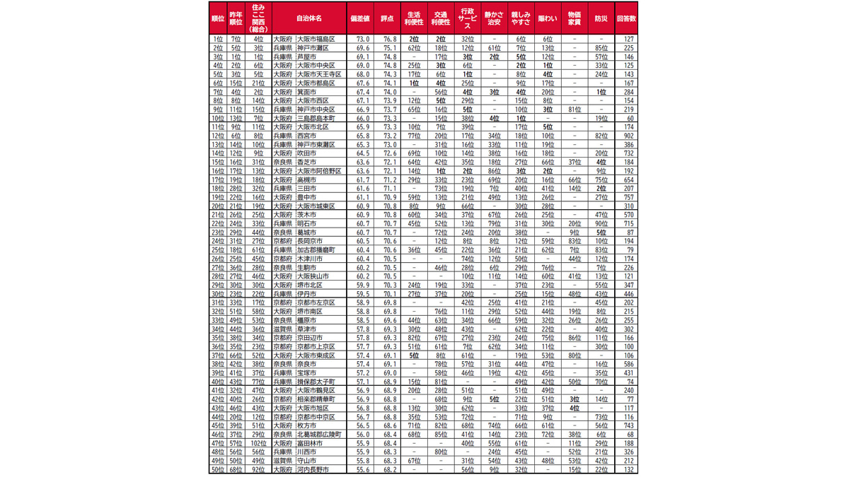 1位は大阪府大阪市福島区で、昨年7位から順位を上げた。2位は、昨年5位から順位を上げた兵庫県神戸市灘区、3位は兵庫県芦屋市という結果に。