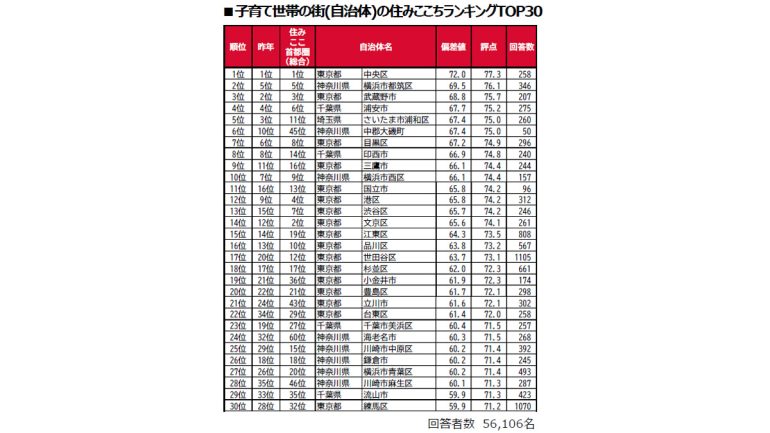 「子育て世帯の街(自治体)の住みここち」トップは、5年連続で「東京都中央区」