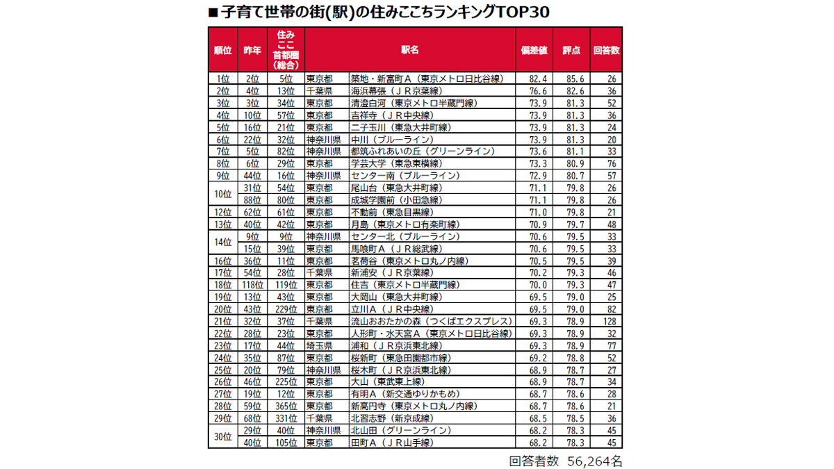大東建託は、首都圏(東京都・千葉県・埼玉県・神奈川県)居住の20歳以上50歳以下、既婚、子どもがいる世帯、合計56,327名を対象に過去最大級の居住満足度調査を行い、「子育て世帯の街の住みここちランキング2025<首都圏版>」として集計したので、結果を紹介しよう。