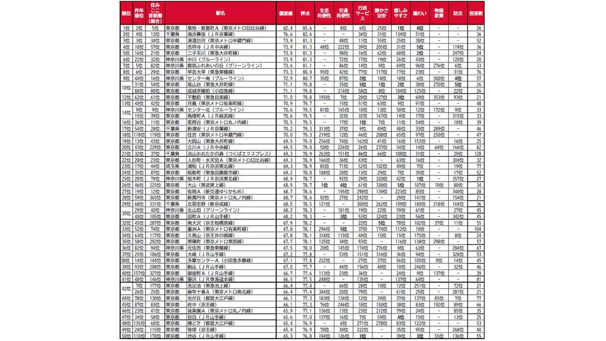 また19位~50位の駅も偏差値60台で相対的に子育て世帯にとって住みここちが良いという評価になっている。