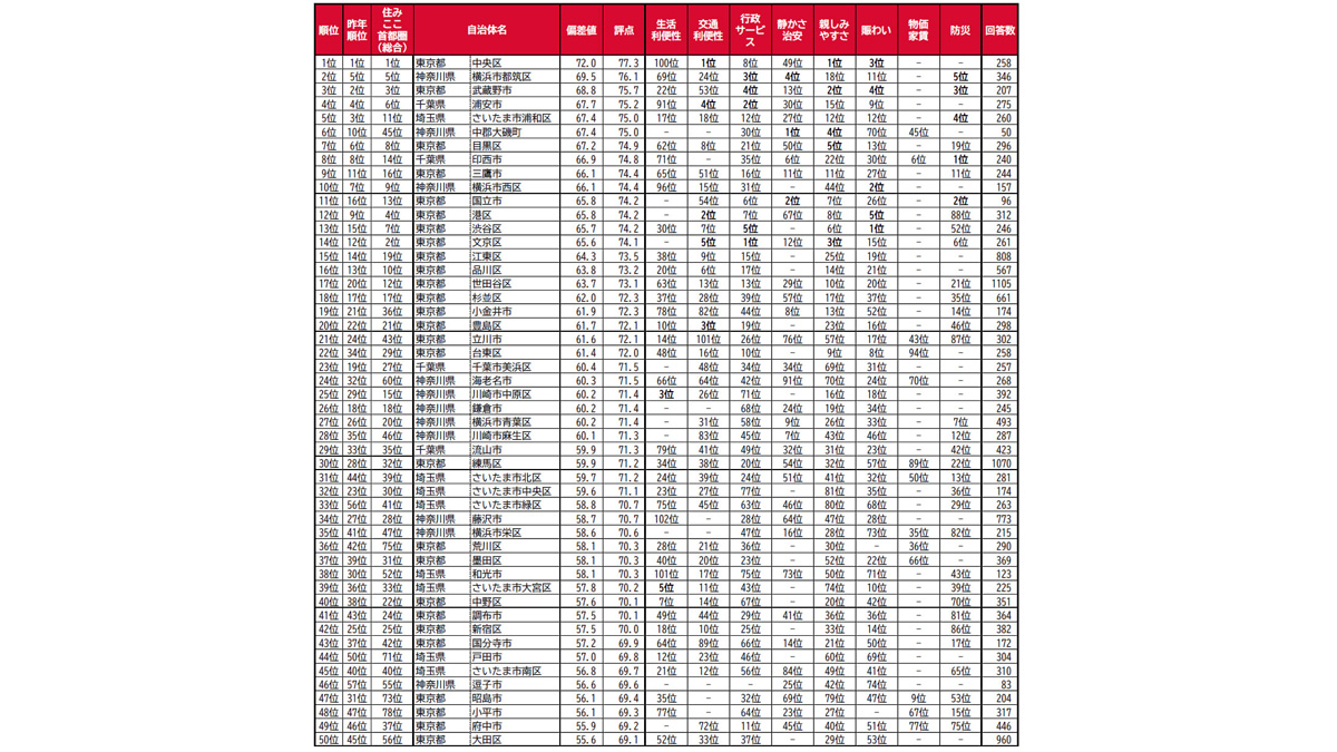1位は5年連続で東京都中央区となり、「住みここち<首都圏版>」でも1位の高い評価を得ていた。2位は神奈川県横浜市都筑区で、昨年5位から順位を上げている。3位は東京都武蔵野市だ。