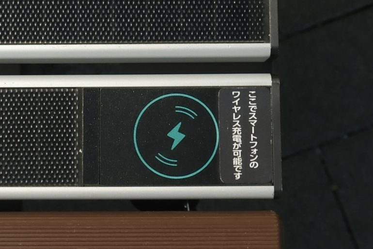 ベンチの端には「ここでスマートフォンのワイヤレス充電が可能です」としっかり記載されていて、散歩にぴったりな癒しの小路に、ある意味似つかわしくないチャージポートが浮かび上がっている。