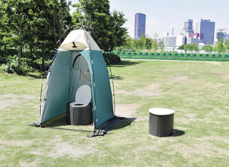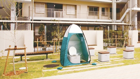 災害時には座面とマンホールの蓋を外すだけで簡単に下水管直結のトイレに変身するスグレモノ。