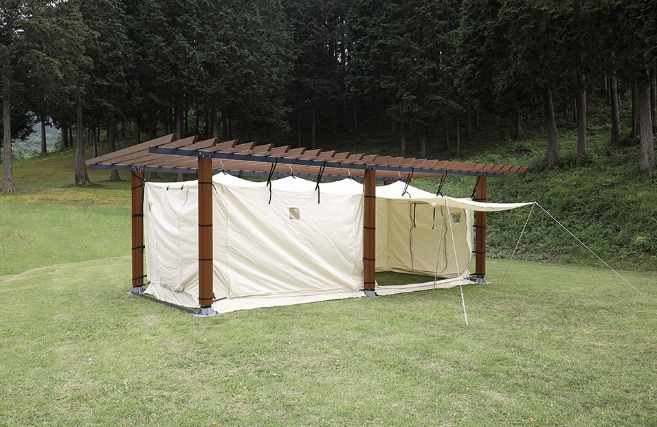 「広い開口部が空気が通りやすく、雨風を防ぐ広くゆったりとした空間を提供します。繰り返し利用可能で、災害時だけでなく地域イベントのテントとしても便利にご利用いただけます」