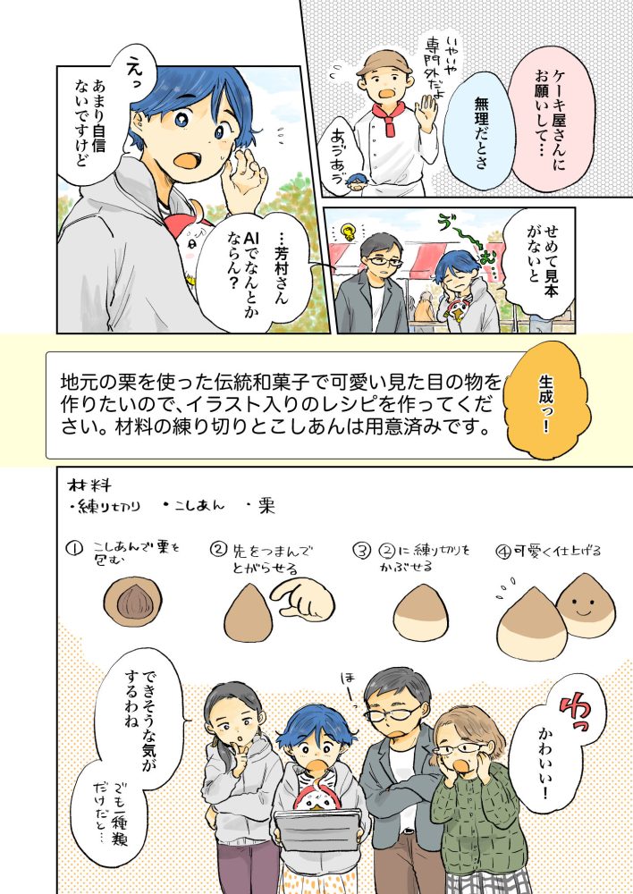今回のネタを作るに当たって、実際に画像生成で和菓子の作成手順や画像付きレシピを生成してみました。結果、ほとんど修正の必要ない手順が文字入りで生成され、思った以上のクオリティだなとちょっとびっくりしました。私としては普段、プレゼンの挿絵が欲しいときなどに時々利用している感じですが、ちょっと違うんだよなぁと思うことも多く、ガンガン使ったりはしていませんでしたが、技術の進歩は凄まじい早さですよね。