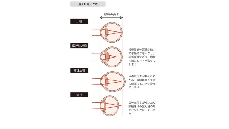 近視とは、眼球が前後に伸びてしまうことで発現する。本来丸い形をしている眼球の奥行きが伸びることで、網膜より手前でピントが合ってしまい、遠くが見えにくくなる。この眼軸の伸長が、近視の根本的な原因だ。