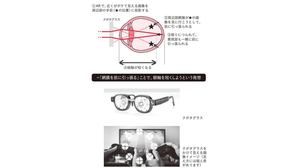 この知見から、光を発するコンタクトレンズや眼鏡の開発へと進んだ。しかし窪田氏は、この技術を他の眼科疾患にも応用できないかと考えた。そこで注目したのが近視だった。