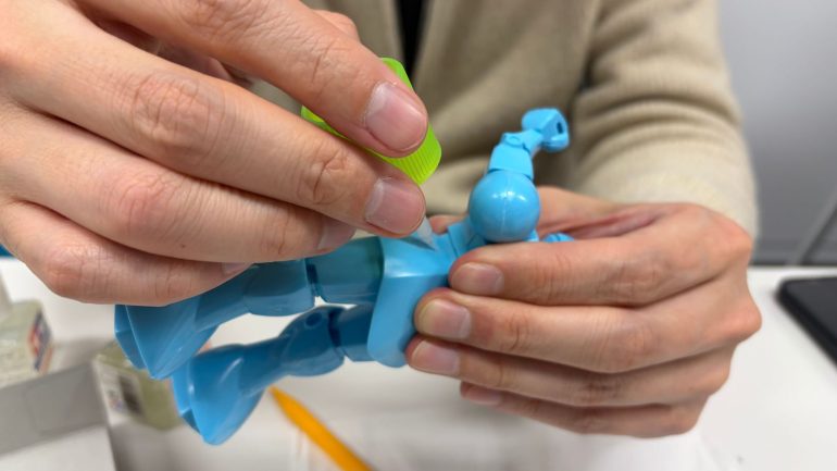 C「今は塗装までするのは上級者というイメージなので驚きですね。そもう一つ気になるのがパーツの接合方法です。今は接着剤なしでパーツをはめることで組み立てられますが、この技術についても教えてください。いつ頃のガンプラから導入されているのですか?」