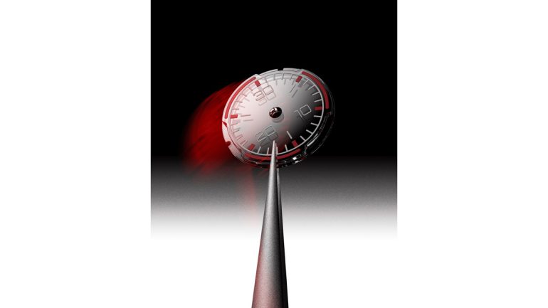 タキメーターと1/5秒目盛りが配されたフランジは、風防の輪郭に沿って湾曲し、視差誤差を最小限に抑える一方、半透明のサファイアクリスタルダイヤルにより、ムーブメントの卓越した仕上げを視覚的に堪能することが可能。