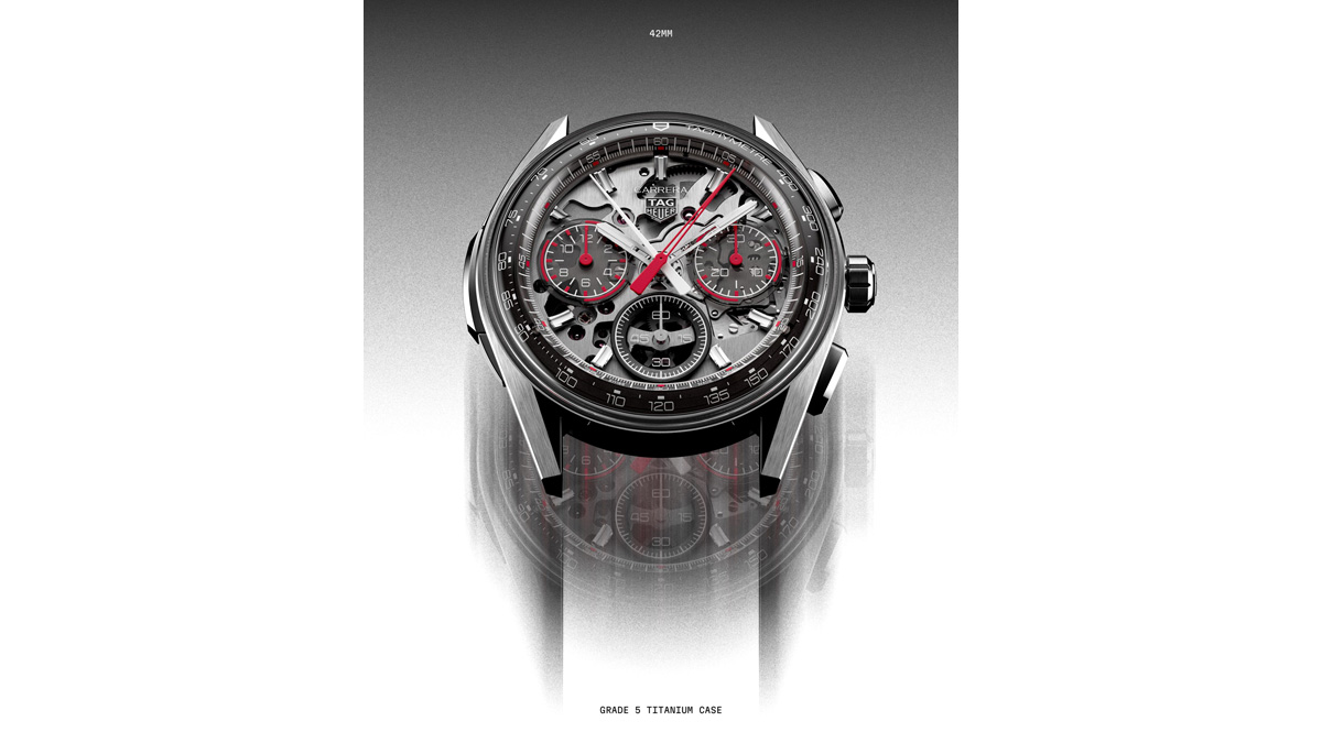 今回発表された「タグ・ホイヤー カレラ スプリットセコンド クロノグラフ」では、まったく新しい42 mmのグレード5チタン製ケースを採用し、タグ・ホイヤーのインハウス デザインチームによって設計された。