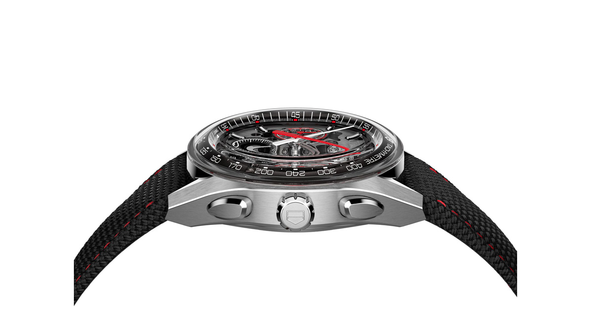 加えて、タグ・ホイヤーの高級時計製造における「透明性」を体現するため、サブダイヤルをメインダイヤルと同一素材で個々に作り上げることで、奥行きをいっそう高めている。